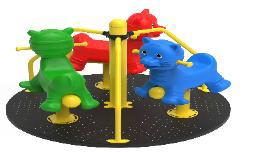 Acest carusel tematic inter1 este conceput pentru a aduce zâmbete celor mici prin designul său jucăuș. Echipamentul dispune de figurine sub formă de pisici în culori contrastante de verde, roșu și albastru, montate pe o bază circulară neagră cu textură antiderapantă. Structura centrală de susținere este de culoare galbenă, asigurând stabilitatea și siguranța necesară în timpul rotației, fiind o piesă ideală pentru a stimula imaginația și interacțiunea socială între copii.
