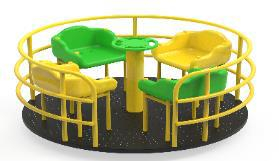 Acest carusel inter1 cu scaune este proiectat pentru a oferi o experiență de rotație confortabilă și sigură pentru mai mulți utilizatori simultan. Echipamentul dispune de patru scaune ergonomice cu spătar, finisate în culori vesele de verde și galben, montate pe o platformă circulară neagră cu textură antiderapantă. Structura centrală și cadrul de susținere galben asigură stabilitate maximă, facilitând interacțiunea socială și dezvoltarea echilibrului într-un cadru de joacă securizat.