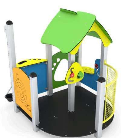 Acest complex de joacă inter1 este conceput special pentru a stimula curiozitatea și dezvoltarea senzorială a celor mici. Structura compactă include un turn protejat de un acoperiș verde, panouri laterale galbene și albastre dotate cu elemente inter1e (precum ferestre și roți de manevră) și o plasă de cățărare galbenă curbată pentru exersarea echilibrului. Este o soluție ideală pentru spații de joacă ce pun accent pe explorarea creativă și siguranță.