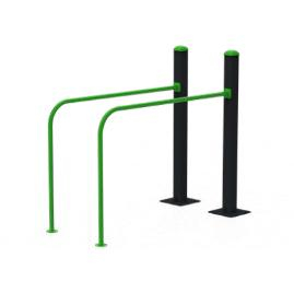 Aceste bare paralele pentru exterior sunt concepute pentru antrenamente de tip calisthenics, fiind ideale pentru exerciții de forță precum flotările la paralele sau ridicările de picioare. Structura este formată din doi stâlpi verticali negri și bare metalice curbate, de culoare verde, care oferă o prindere ergonomică și stabilă. Datorită construcției simple și durabile, acest aparat este perfect pentru dotarea parcurilor de sport în aer liber, fiind rezistent la utilizare intensă și la condițiile meteorologice.