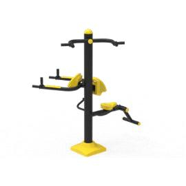 Acest echipament de fitness pentru exterior este o stație completă de antrenament, dotată cu multiple posturi de lucru pentru brațe, spate și picioare. Structura verticală din metal negru include mânere și elemente mobile galbene, permițând utilizarea simultană de către mai mulți sportivi. Este fabricat din materiale rezistente la intemperii, fiind ideal pentru parcuri publice sau zone de antrenament urban.