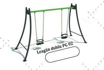 Leagănul dublu PG 02 este un echipament de joacă cu o structură metalică modernă, formată din doi piloni laterali curbați de culoare neagră și o bară transversală superioară verde, oferind un design minimalist și stabil. Acesta este echipat cu două șezuturi identice de tip scaun de siguranță, dotate cu bariere de protecție perimetrale negre pentru a asigura stabilitatea și siguranța copiilor în timpul balansului. Suspendarea șezuturilor se realizează prin corzi sau lanțuri verzi, integrate cromatic cu bara superioară, permițând utilizarea simultană de către doi copii.