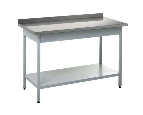 Masă robustă realizată din inox, perfectă pentru utilizare în medii profesionale, prevăzută cu poliță și bordură la perete pentru un plus de funcționalitate și igienă. Dimensiunile sale sunt 1000 mm lungime, 550 mm lățime și 850 mm înălțime, facilitând organizarea și utilizarea eficientă în spații de lucru diverse, inclusiv bucătării industriale sau spații de preparare alimentară.