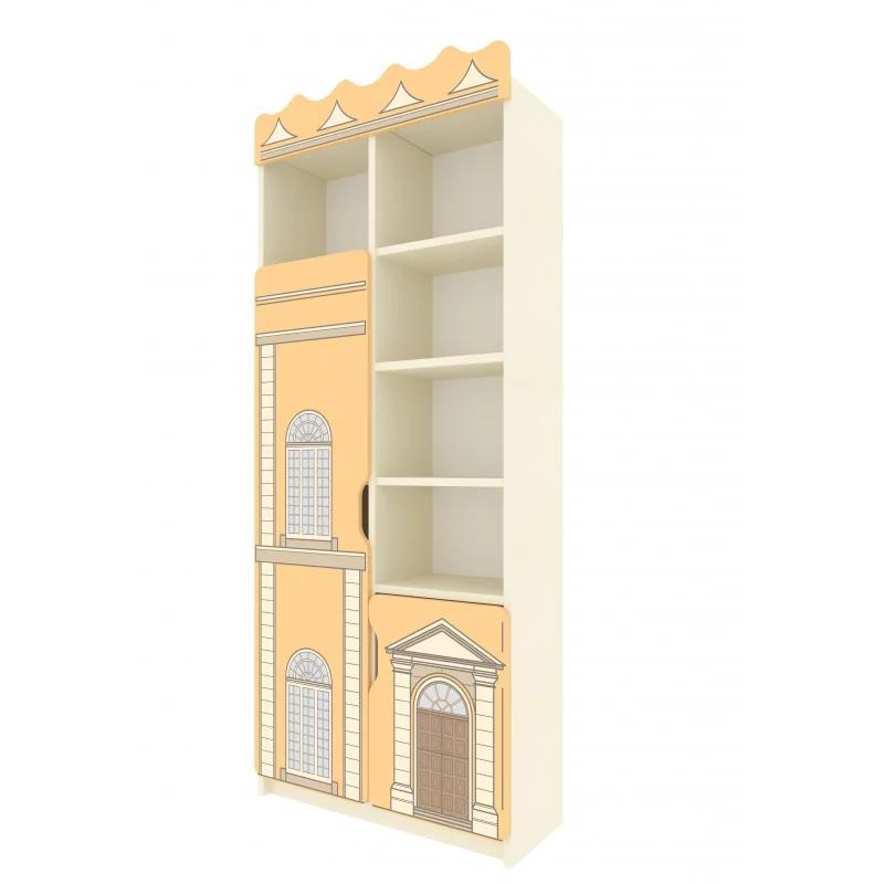 Dulapul este confectionat din PAL melaminat cu grosimea de 16 mm, iar peretele din spate este din PFL melaminat alb de 3 mm. Fatada dulapului este bordată cu cant din ABS pentru durabilitate. Are două uși de dimensiuni diferite, cu colțuri rotunjite și loc special pentru deschidere. Ușile sunt decorate cu o imprimare foto a unei clădiri, acoperită cu lac acrilic non-toxic pe bază de apă, care oferă rezistență la daune și permite curățarea umedă. Dulapul este împărțit în două părți, cu 5 rafturi deschise și 7 închise, iar toate elementele sunt fixate cu accesorii speciale și prevăzute pentru prindere de perete pentru siguranța copiilor. Culoarea corpului dulapului este crem, iar fațada prezintă imprimarea foto. Garanta este de 24 luni.