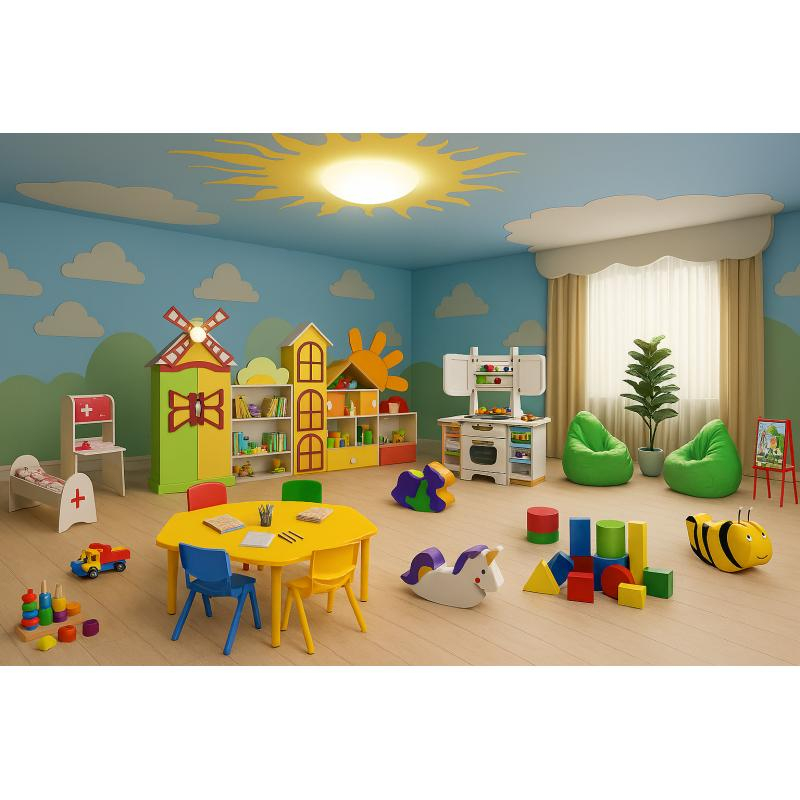 Set mobilier pentru zona de joacă "Poienița cu flori", incluzând mobila adaptată pentru camere de joacă. Setul conține mai multe componente precum setul de mobilă principal, fotoliu-sac "Pară", masa hexagonală, balansoar, scaun din plastic colorat, set mobila "Spital" și mobilier „Bucătărie", oferind un mediu complet și distr1 pentru copii.