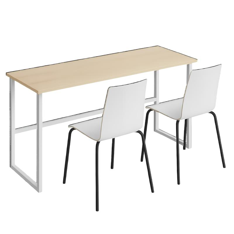 Set mobilier scolar dublu compus din masă și scaune. Masa are dimensiunile 1200x500x760 mm și greutate de 16,30 kg, cu blat din PAL melaminat și cadru metalic realizat din două suporturi laterale unite printr-o traversă pentru stabilitate. Capacele din plastic protejează pardoseala. Scaunele au șezut și spătar din placaj îndoit cu acoperire HPL de 0,5 mm, formând un monobloc cu colțuri rotunjite pentru siguranță. Cadrul scaunelor este din țeavă metalică rotundă cu diametrul de 20 mm și grosimea de 1,5 mm, cu acoperire pulbere polimerică. Culoarea blatului și a scaunelor se regăsește în mai multe nuanțe de fag, stejar, gri, albastru, crem, verde și altele. Perioada de garanție este 24 luni.