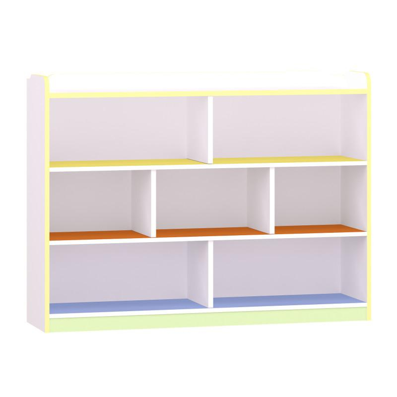 Этажерка для игрушек размером 1200x300x900 мм состоит из 7 секций/открытых полок разных размеров, что позволяет эффективно организовать пространство. Изготовлена из ламинированного ЛДСП толщиной 16 мм, фасад покрыт желтой ABS-кромкой толщиной 1 мм. Все элементы соединены специальной и надежной фурнитурой, этажерка предусмотрена для крепления к стене. Оснащена пластиковыми ножками с регулировкой высоты, что позволяет устанавливать на любую поверхность. Цвет корпуса белый, полки окрашены в оранжевый, синий и зеленый цвета. Рекомендуется для организации игровых пространств или детских комнат, обеспечивая практичную и яркую мебель.