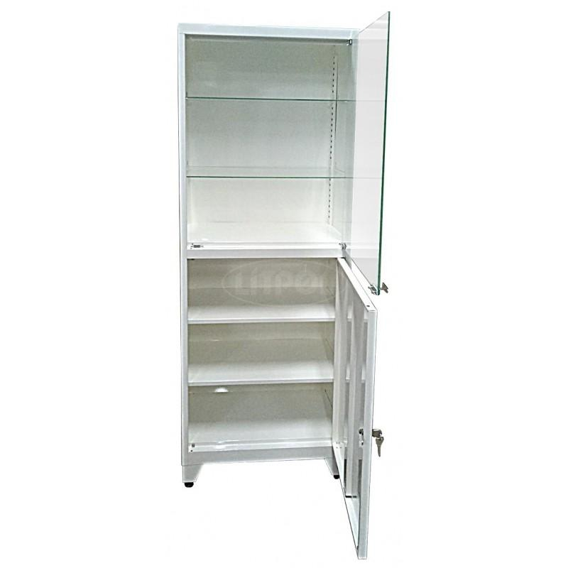 Медицинский металлический шкаф с одной дверью, размеры 1800 мм в высоту, 400 мм в глубину и 600 мм в ширину. Конструкция выполнена из стали с полимерным покрытием, толщина корпуса 0,6 мм, двери — 0,7 мм. Верхняя часть оснащена двумя полками и стеклянной дверью (толщина стекла двери 4 мм, полок 5 мм), нижняя часть — металлической дверью с двумя полками. Магнитные хромированные замки фиксируют стеклянную дверь, а корпус оснащён замком с ключом на металлической двери. Максимальная нагрузка — 30 кг на металлических полках и 10 кг на стеклянных. Изделия поставляются в разобранном виде и включают четыре регулируемых опоры высотой 100-125 мм. Гарантийный срок 24 месяца.