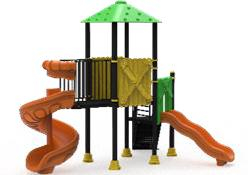 Представленный игровой комплекс — это средних размеров уличная конструкция, предназначенная для различных видов лазания и спуска в компактном формате. Эта модель выделяется интеграцией спиральной горки, которая максимизирует удовольствие от игры на оптимизированной площади, поддерживаемой прочной конструкцией с черными стойками и желтыми защитными основаниями.