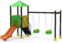 Представленный игровой комплекс — это многофункциональный уличный ансамбль высотой 3400 мм, разработанный для предоставления разнообразных развлекательных возможностей в компактной и безопасной конструкции. Его дизайн включает смотровую башню с элементами качелей, используя естественную цветовую палитру на основе зеленого, желтого и черного, идеально подходящую для интеграции в парки или детские сады.