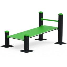 Эта уличная фитнес-скамья специально разработана для упражнений на пресс и укрепления мышц кора. Конструкция выполнена из прочных чёрных металлических столбов, надёжно закреплённых, и оснащена зелёной поверхностью, устойчивой к износу и погодным условиям. Оборудование включает поперечную металлическую перекладину для фиксации ног, обеспечивая необходимую стабильность для правильного выполнения упражнений на пресс. Эргономичный и прочный дизайн делает её идеальной для общественных спортивных парков или калистенических тренировочных зон.