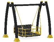 Изогнутая качеля для людей с ограниченными возможностями — это инклюзивное игровое оборудование, спроектированное с прочной металлической конструкцией черного цвета и желтыми опорными основаниями для максимальной устойчивости. Она оснащена просторным сиденьем в виде черной платформы с решеткой, окруженной желтой защитной рамой и поддерживаемой жесткими стержнями для обеспечения контролируемого и безопасного качания. Вся конструкция изготовлена из долговечных материалов, устойчивых к непогоде и износу, соответствуя необходимым стандартам безопасности для обеспечения доступного и комфортного игрового опыта.