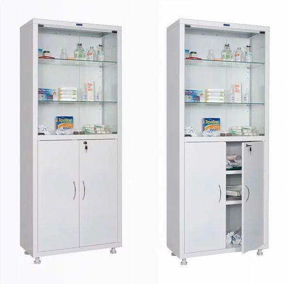 Металлический шкаф ШМ-02-«МСК» предназначен для хранения и сохранения медикаментов, перевязочных материалов и других медицинских изделий. Изготовлен из стального листа с экологичным полимерным покрытием, устойчивым к дезинфицирующим средствам. Верхняя часть оснащена двойной стеклянной дверцей и двумя стеклянными полками, нижняя часть — двойной металлической дверцей и двумя металлическими полками. Размеры: глубина 320 мм, ширина 700 мм, высота 1655 мм. Максимальная нагрузка 45 кг. Каркас из стали с листом 0,8 мм, разборная конструкция с регулируемыми ножками, цвет белый.