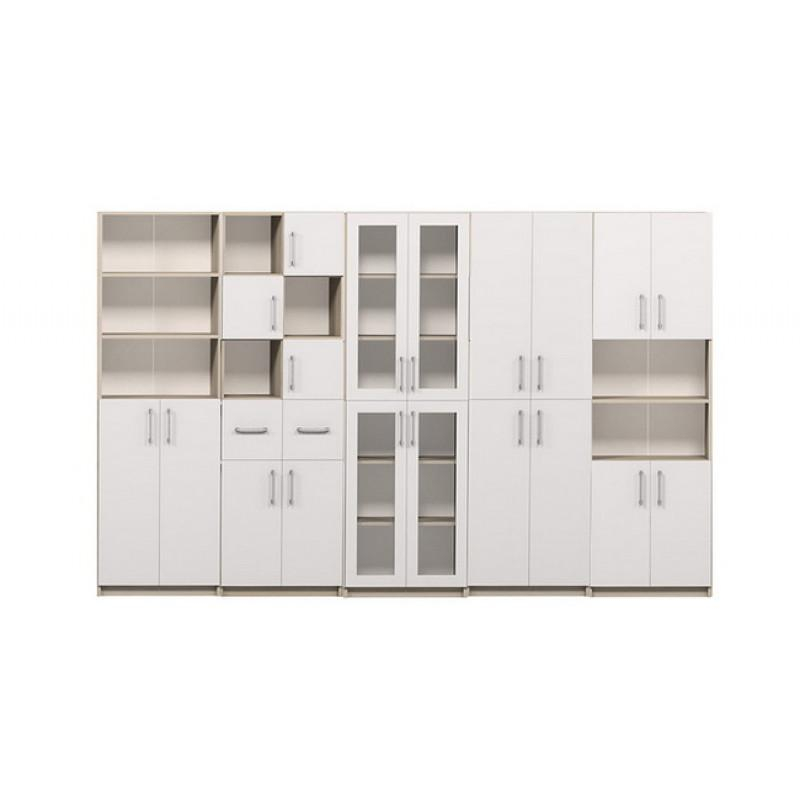 Набор шкафов 0711 состоит из 5 отделений: 1) полуоткрытый шкаф с двумя дверями, 3 закрытые и 3 открытые полки с регулировкой высоты; 2) комбинированный шкаф с пятью дверями, 5 закрытых полок, 3 открытых полки и 2 выдвижных ящика на телескопических направляющих с регулировкой высоты; 3) шкаф с 4 дверцами из прозрачного стекла толщиной 4 мм и 6 закрытыми регулируемыми полками; 4) шкаф с четырьмя дверями и 6 закрытыми регулируемыми полками; 5) полуоткрытый шкаф с четырьмя дверями, двумя открытыми и четырьмя закрытыми регулируемыми полками. Материалы включают ламинированную ДСП толщиной 18 мм для корпуса, меламиновые фасады светло-серого и цвета перламутрового мастера, заднюю стенку из белой меламиновой ДВП толщиной 2,5 мм. Набор оснащён пластиковыми ножками и имеет цвет перламутровый мастер и светло-серый. Общие размеры: 3510x405x2115 мм. Гарантийный срок: 24 месяца.