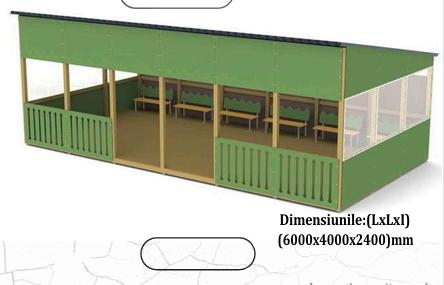 Павильон с полом и скамейками — просторная уличная конструкция размером 6000 x 4000 x 2400 мм. Предназначен как защищённое место для отдыха, оснащён внутренними скамейками вдоль стен и встроенным полом, обеспечивая комфортную среду для групп людей в парках или зонах отдыха.