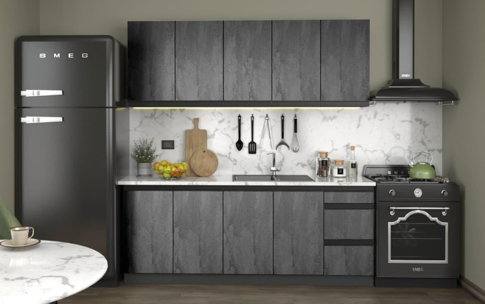 Кухонный гарнитур Yasen Niagara общей длиной 200 см изготовлен из ЛДСП с фасадом в оттенке металлического серого камня и корпусом графитового цвета. Комплект включает верхние и нижние шкафы с различными конфигурациями: верхний шкаф с сушилкой (80x71,5 см), верхние и нижние шкафы размером 80x71,5 см и 40x71,5 см, включая нижний шкаф с 3 телескопическими ящиками. Столешница и бытовая техника в комплект не входят. Стиль современный, с матовой текстурой и общим серым цветом.