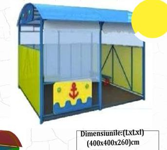 Представленный павильон Color — уличная конструкция для отдыха размером 400 x 400 x 260 см. Выполнен в морском тематическом дизайне с использованием цветовой гаммы синего и желтого, украшен визуальными элементами, такими как красный якорь на фоне, напоминающем морские волны.