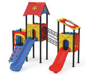 Этот расширенный игровой комплекс из серии KEK предназначен для полного приключенческого опыта, сочетая элементы скольжения и равновесия. Основная структура включает две башни с красными крышами: одна оснащена синей горкой с интегрированной скалодромной стеной, а другая — классической красной горкой. Две секции соединены подвесным мостиком с защитной сеткой, стимулируя координацию и смелость маленьких исследователей в яркой и безопасной обстановке.