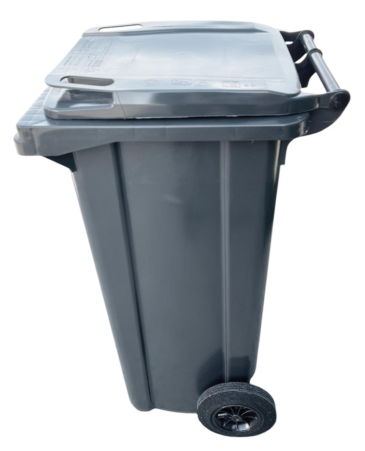 Контейнер для транспортировки отходов, объем 120 литров, оснащен колесами, темно-серого цвета, произведен в Греции.
