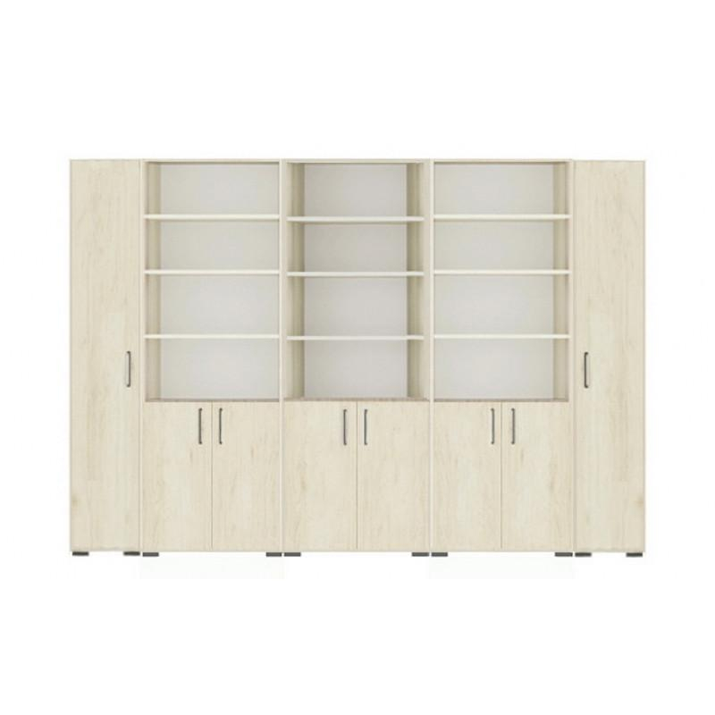 Set de mobilier. Dimensiuni (Lxlxh): 2877x405x2025 mm. Fabricat din PAL melaminat cu grosimea de 18 mm. Fațada setului este lipită cu cant din ABS de 1 mm, iar piesele din interior cu cant ABS de 0,5 mm. Peretele din spate este confecționat din PFL melaminat alb, grosime 3 mm. Setul este compus din 5 compartimente: două dulapuri coloană cu câte 5 rafturi, dintre care 3 reglabile pe înălțime, și trei dulapuri semi-închise cu 3 rafturi deschise sus și rafturi închise jos. Piesele sunt asamblate cu elemente speciale și sigure și sunt dotate cu picioare din plastic. Culori: perla artizan și stejar urban cafeniu.