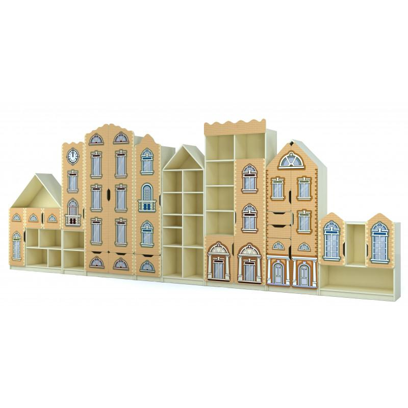 Set de dulapuri „Orașul vechi” cu imprimare foto (cod produs 5600/2) este format din opt dulapuri separate cu rafturi deschise, închise și sertare. Mobilierul este realizat din PAL laminat de 16 mm și PFL melaminat alb de 3 mm pe spate, cu cant ABS pentru durabilitate. Ușile au colțuri rotunjite, sunt decorate cu o imprimare foto rezistentă și acoperite cu lac acrilic pe bază de apă, non-toxic. Setul include elemente sigure pentru copii, fiind prevăzut pentru fixare pe perete. Dimensiuni totale: 5400x320x2030 mm, culoare crem și fațadă imprimată foto cu motive de clădiri vechi, ferestre și uși decorative. Garantație 24 luni. Este disponbil și modular, putând fi achiziționat pe secții separate.