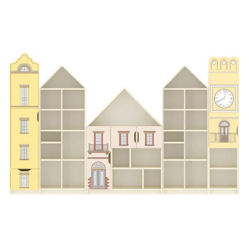 Setul de dulapuri „Orașul vechi” este realizat din PAL laminat de 16 mm grosime, cu peretele din spate din PFL melaminat alb de 3 mm. Fațada are cant ABS și este decorată cu imprimare foto non-toxicǎ, protejată cu lac acrilic pe bază de apă pentru rezistență sporită. Setul include 5 secții separate cu rafturi deschise, rafturi închise și sertare, încadrate de uși cu colțuri rotunjite și un loc special pentru deschidere. Elementele sunt conectate cu furnituri speciale și sigure, cu posibilitatea fixării pe perete pentru siguranța copiilor. Culoarea corpului este crem, iar fațadele sunt colorate cu imprimare foto în nuanțe de galben și bej. Perioada de garanție este de 24 luni. Produsul poate fi comandat modular.