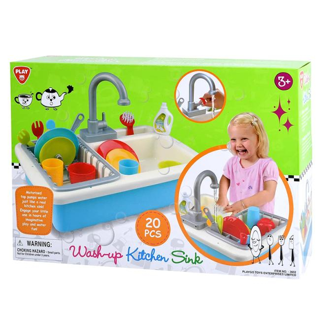 Principalul punct culminant al acestui set de 20 de piese este o chiuvetă cu robinet care se umple cu apă și un set de vase. Acest set de joacă tematic va atrage fetele tinere cărora le place să amenajeze o bucătărie improvizată în camera lor adăugând această chiuvetă la alte ustensile de bucătărie. Fetele cu interes se vor imagina în rolul unei gazde spălând vase în chiuvetă folosind apă adevărată. Chiuveta este formată din două părți, puteți pune vase într-una dintre ele, apoi după ce ați spălat totul, utilizați a doua parte ca uscare. Pentru un realism mai mare, setul include o perie și o sticlă. Apa circulă în chiuvetă și curge înapoi în rezervor. Instrucțiunea este atașată.