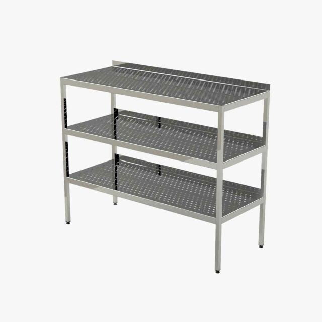 Acest model de stelaj cu polițe tip grilă este ideal pentru spațiile unde circulația aerului în jurul obiectelor depozitate este esențială. Structura metalică solidă cu trei niveluri oferă un suport stabil pentru vase, containere sau diverse materiale profesionale. Designul deschis permite scurgerea apei, fiind foarte practic pentru depozitarea veselei proaspăt spălate. Materialul calitativ garantează o durabilitate crescută, chiar și în medii cu umiditate ridicată.
