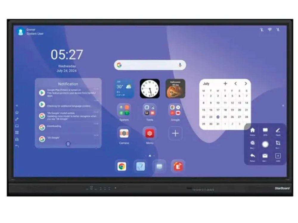 Ecran inter1 StarBoard cu diagonala de 165,1 cm, rezoluție 4K, touchscreen și Android 14, cu 8GB RAM și 128GB stocare.