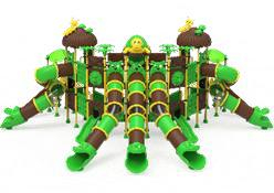 Acest complex de joacă monumental este o structură de tip fortăreață, proiectată pentru a maximiza capacitatea de joacă și diversitatea 1ităților. Designul său simetric include o baterie impresionantă de patru tobogane tubulare verzi montate frontal și multiple turnuri cu acoperișuri tematice ce amintesc de elemente naturale. Este un echipament de înaltă performanță, ideal pentru destinații recreative majore, oferind trasee complexe de explorare și multiple niveluri de interacțiune pentru copii.