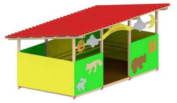 Acest pavilion tematic este o structură recreativă veselă, concepută pentru a oferi un spațiu de joacă acoperit și atr1 pentru copii. Designul se remarcă prin acoperișul roșu vibrant și panouri laterale galbene decorate cu motive ludice, fiind ideal pentru grădinițe, parcuri sau locuri de joacă rezidențiale.